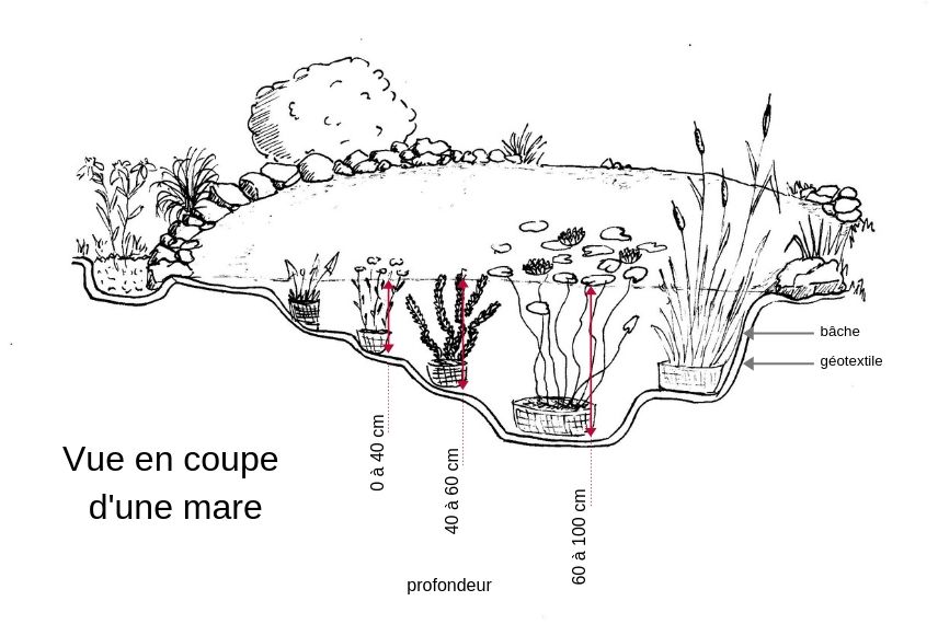 Le creusement devra se faire de façon à ce que différents niveaux se créent. Une partie profonde d’au moins un mètre de profondeur permettra de garder une zone hors-gel (dans une certaine mesure). Créer différents niveaux permettra d’accueillir différents types de végétaux : plantes submergés, plantes flottantes, plantes semi-aquatiques et plantes de berges. La partie profonde servira aussi à garder une zone de protection pour les animaux qui ne s’asséchera pas en été et dont la température sera plus constante en hiver.