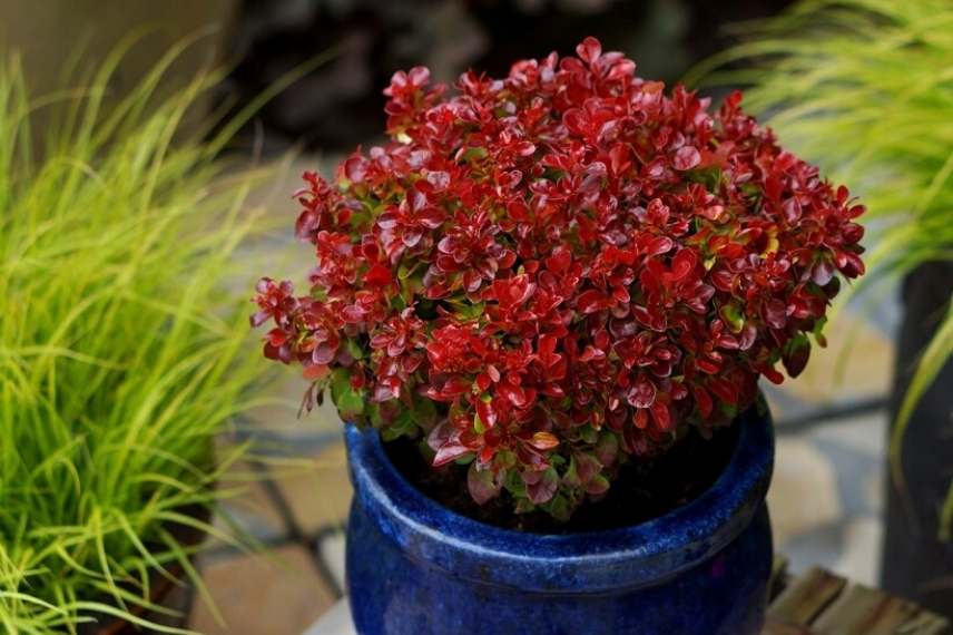 La taille du Berbéris thunbergii ‘Lutin Rouge’ convient parfaitement à une culture en pot