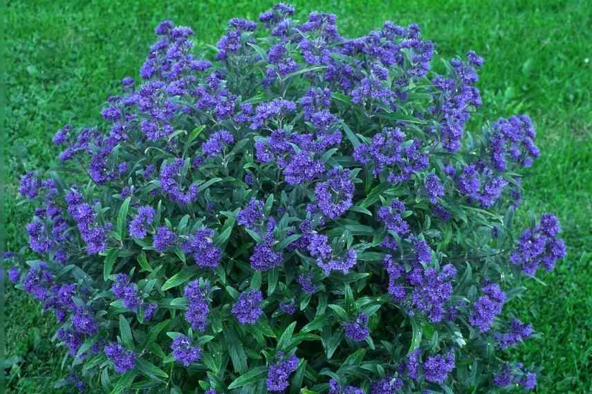 - Le Caryopteris clandonensis ‘Blue Balloon’ forme un buisson arrondi au feuillage vert-foncé et aux fleurs bleu lavande.