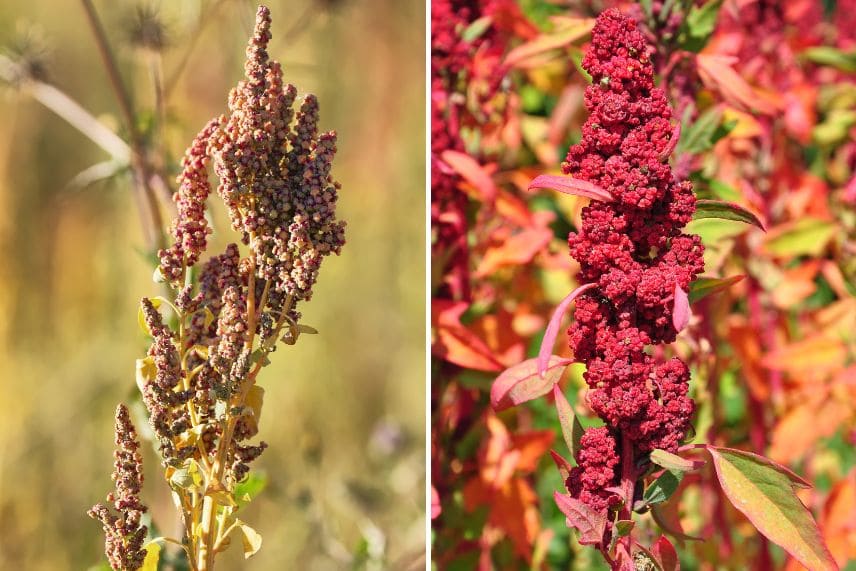 Les panicules, remplies de graines, du quinoa atteignent entre 30 et 80 cm. Au fil de leur maturité, elles passent du vert clair à leur couleur finale, le plus souvent rouge. En général, lorsque les panicules sont prêtes à être récoltées, les graines se détachent facilement au frottement.