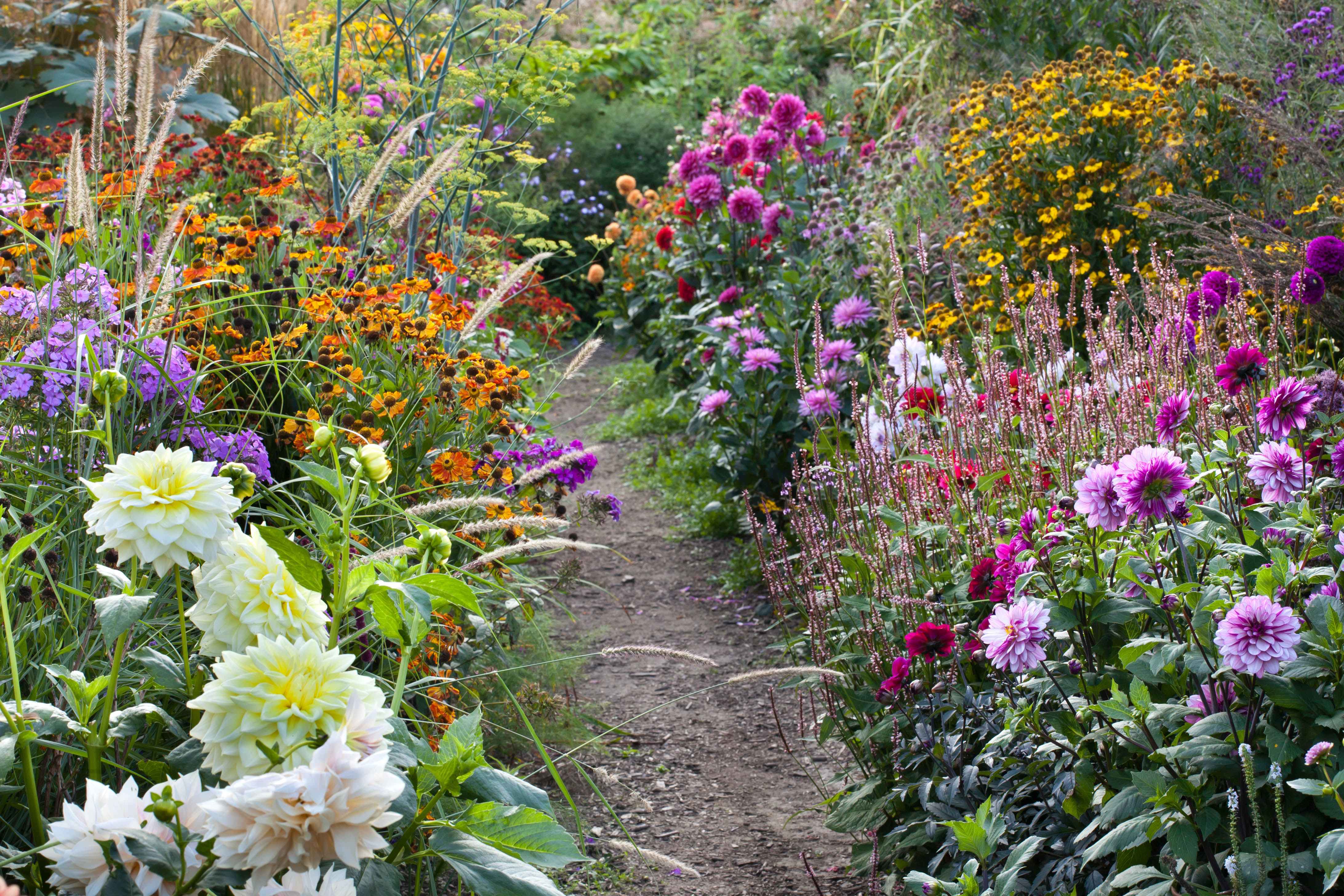 Les Dahlia nains et dahlias hauts composent une bordure joyeuse mêlés au Pennisetum, aux Helenium, au Phlox – © Gap photos Robert Mabic