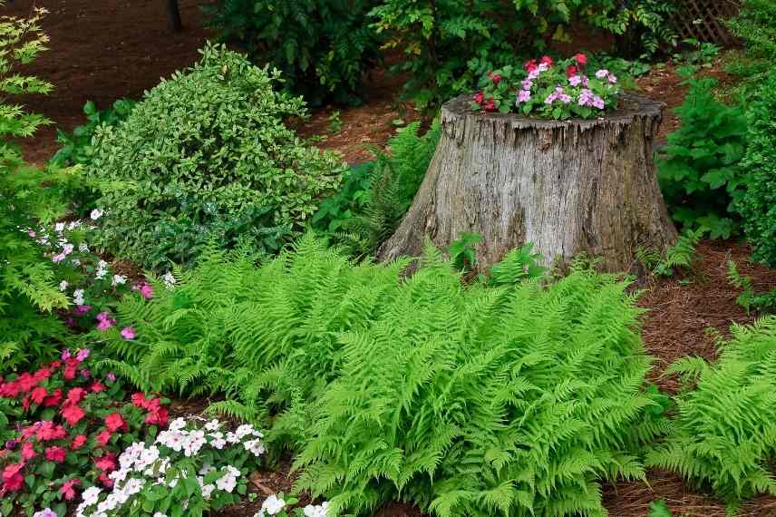 Les mousses, fougères, lierres et autres lichens recouvriront votre ancienne souche d’arbre formant une composition très agréable pour l’œil au fil des saisons.