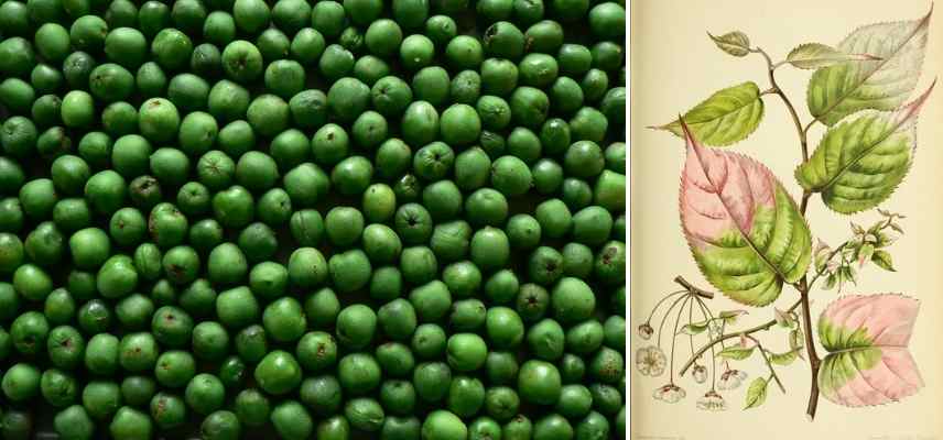 Fruits du Kiwaï (à gauche) et planche botanique du Kiwi kolomita