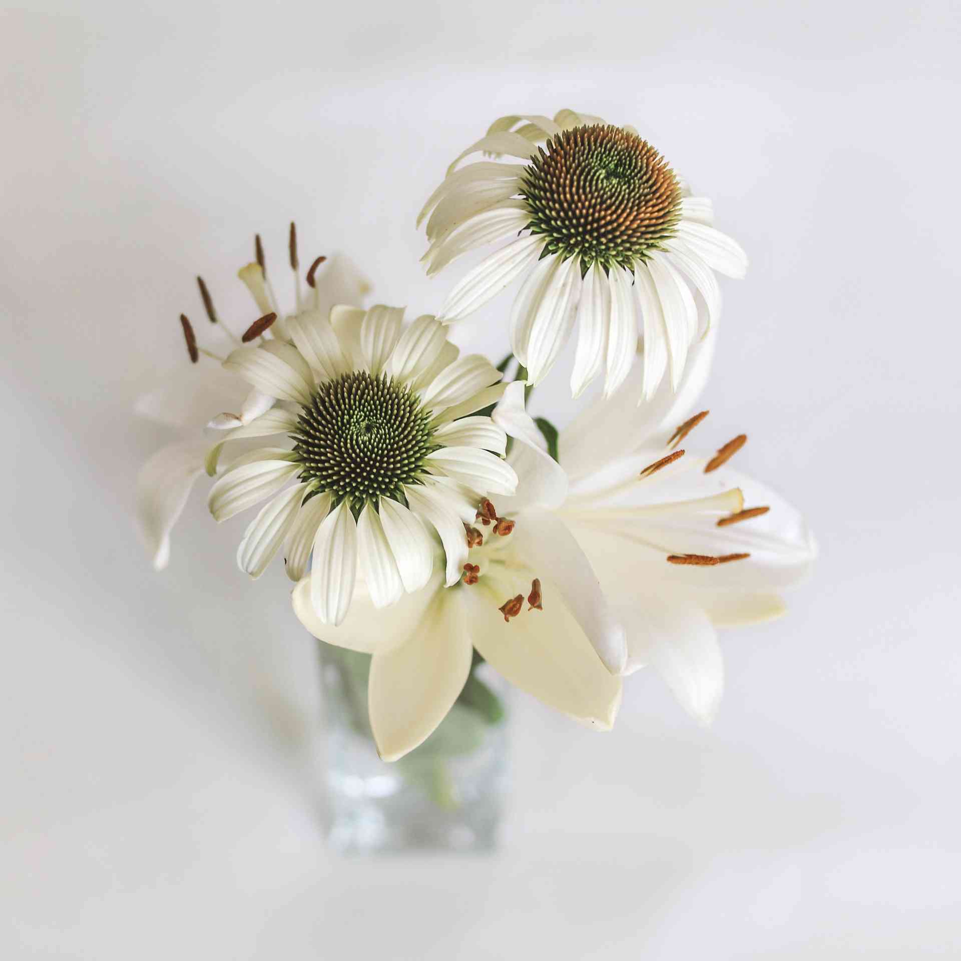 Il existe une échinacée pour chaque envie ! Pour un tableau romantique mais tonique, on rapproche les échinacées à fleurs vertes comme l’Echinacea ‘Green Jewel’, à fleurs blanches ‘Purity’ d’une fraîcheur inouïe, d’autres fleurs blanches dont les formes contrastent (sauges arbustives, glaïeuls nains, hémérocalles, œillets). Magnifique aussi en compagnie d’Asters, d’Achillées, de marguerites. Une scène allégée par la présence de quelques graminées ornementales ou d’une vivace aérienne comme la Sanguisorba ‘Alba’.
