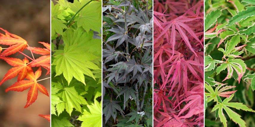 Acer palmatum ‘Orange Marmalade’, Acer shirasawanum (photo André Abrahami), Acer palmatum ‘Atropurpureum’, Acer palmatum ‘Red Pygmy’ (photo Dinkum), et Acer palmatum ‘Butterfly’