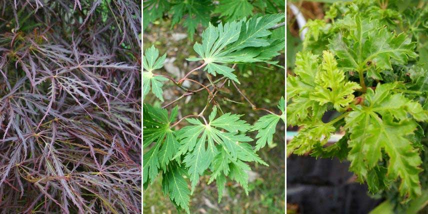 Acer palmatum ‘Dissectum’ (photo Bostonian13), Acer japonicum ‘Aconitifolium’ (photo Kenraiz) et Acer palmatum ‘Shishigashira’
