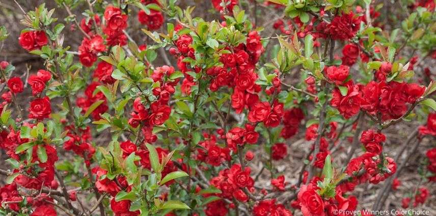 Le Cognassier du Japon ou Chaenomeles est un très bel arbuste remarquable pour sa floraison précoce, en toute fin d’hiver, dès le mois de février sur les rameaux encore nus. Ses fleurs délicates et cireuses se déclinent dans une infinie variété de coloris dont des rouges écarlates à l’instar de ‘Hot Fire’ . Le Cognassier du Japon ‘Scarlet Storm’ affiche lui aussi, tout le long de ses rameaux, de très grandes fleurs de camélia doubles, d’un rouge sombre et profond. ‘Rubra’ est une forme splendide à fleurs rouge foncé.