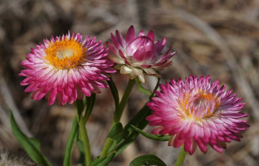 Les Immortelles à bractées (Xerochrysum ou Helichrysum bracteatum) font partie des plus connues. Elles sont très florifères et leurs coloris sont lumineux. C’est la fleur de bouquet sec par excellence ! Un peu moins répandue, l’Immortelle d’Australie ou Acroclinium (Helipterum roseum) est également très intéressante pour le contraste entre son centre noir et jaune et ses pétales blancs ou roses, à la texture de papier glacé. Ce sont deux plantes annuelles faciles à semer. L’Immortelle d’argent (Anaphalis margaritacea) est vivace, elle tout aussi facile de culture et porte une nuée de petits pompons blanc argent, réunis en bouquets.