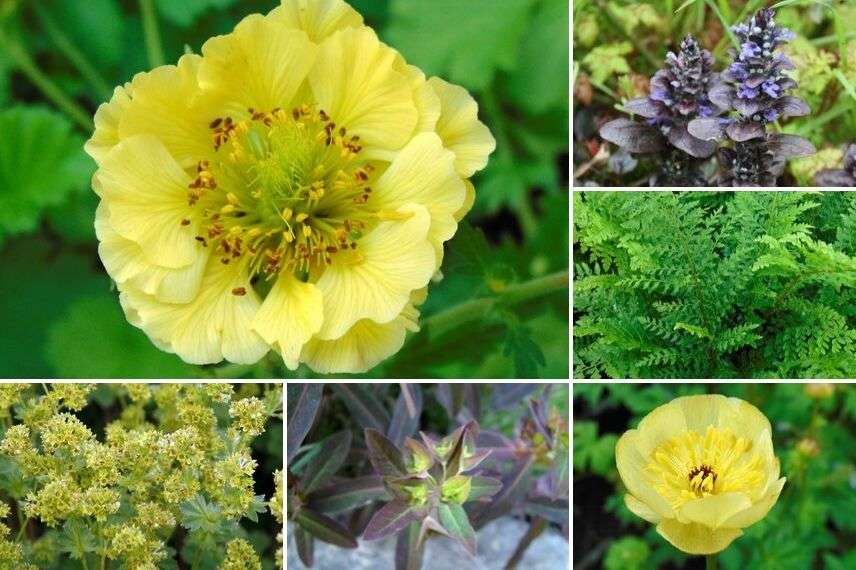 Un exemple d’association à mi-ombre : Geum ‘Gimlet’, Ajuga reptens ‘Black Scallop’, Polystichum setiferum ‘Proliferum’, Trollius ‘Cheddar’, Euphorbia dulcis ‘Chameleon’ et Alchemilla erythropoda