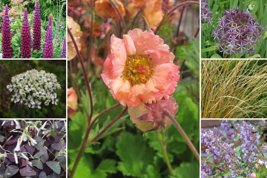 Un exemple d’association en bordure : Geum ‘Mai Tai’, Lupin ‘West Country Masterpiece’ (en arrière-plan), Allium nigrum, Oxalis triangularis, Allium christophii, Carex comans ‘Milk Chocolate’ et Nepeta ‘Purrsian Blue’