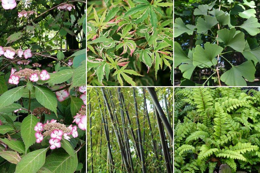 Choisissez l’Hydrangea serrata, qui est originaire du Japon et profitez-en pour composer un jardin à l’ambiance asiatique. Il se plait à mi-ombre, dans un environnement relativement frais, et il apprécie les sols humifères et non calcaires. Si vous avez la chance de posséder un petit bassin, profitez-en pour composer un jardin asiatique autour de celui-ci. Vous pouvez aussi réaliser un décor minéral avec des rochers et une zone de graviers sur laquelle vous dessinerez des motifs à l’aide d’un râteau (vagues, ondulations…). Intégrez des érables du Japon : ces arbustes sont remarquables pour leur élégante silhouette, très graphique, et leur beau feuillage découpé, prenant de superbes teintes rouges en automne. Vous pouvez installer sur les zones externes du jardin des bambous, afin de fermer l’espace et de créer un environnement clos. Installez également quelques pins taillés en nuage (niwaki). Profitez également du superbe feuillage du Ginkgo biloba. Vous pouvez aussi composer des massifs en associant des fougères, des fougères, des Arisaema, Hakonechloa macra, Astilboides tabularis, Rodgersia… Pensez aussi à l’Helxine, qui forme un superbe tapis vert, très uniforme et ressemblant à de la mousse, qui met en valeur le relief naturel du terrain.