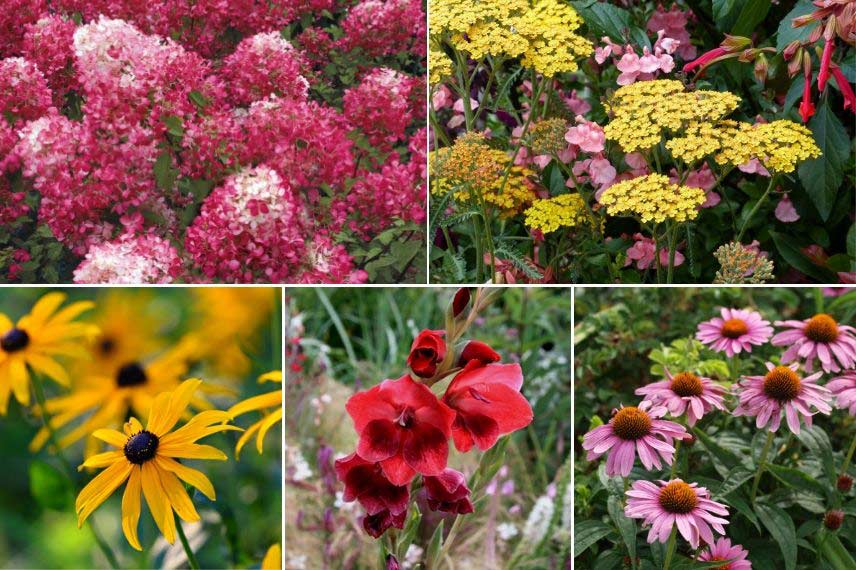 Profitez des Hydrangea paniculata pour composer un massif coloré, au soleil. Nous vous conseillons notamment la variété Hydrangea paniculata ‘Diamant Rouge’, qui porte des inflorescences denses, au départ blanches se colorant rapidement d’un rouge intense. Nous vous conseillons d’installer à ses côtés des Rudbeckias, dont les belles fleurs jaunes amèneront de la luminosité. Ajoutez des géraniums vivaces, des échinacées et des achillées. Profitez aussi de la floraison colorée des Glaïeuls : ils se déclinent dans une large gamme de variétés, aux couleurs souvent vives et lumineuses, ce qui ne vous laissera que l’embarras du choix dans les teintes et coloris. Rien de tel que des graminées, comme les Pennisetums, pour sublimer ces floraisons et alléger le massif ! En fond de massif, aux côtés des Hydrangea paniculata, intégrez d’autres arbustes tels que les Lagerstroemia et Lauriers-roses.