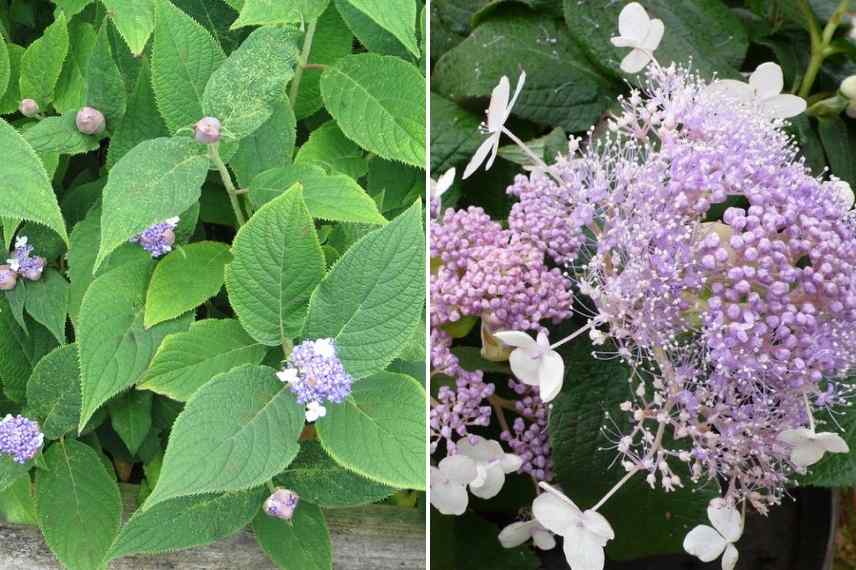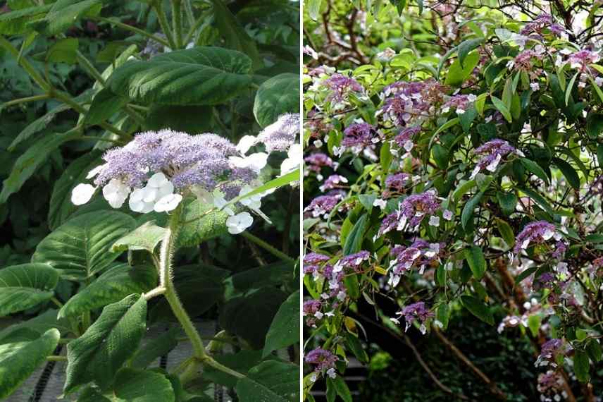 Hydrangea aspera ‘Villosa’ : fleurs et velouté du feuillage (© Peganum). A droite, silhouette (©Leonora Enking)