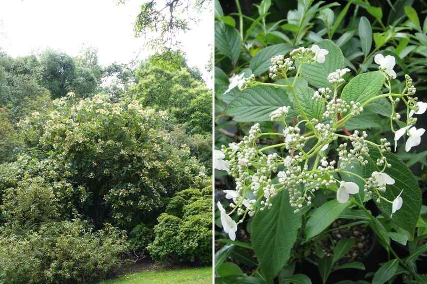 La silhouette grandiose de l’Hydrangea heteromalla. A droite, floraison du cultivar ‘Snow Cap’ (© Peganum)