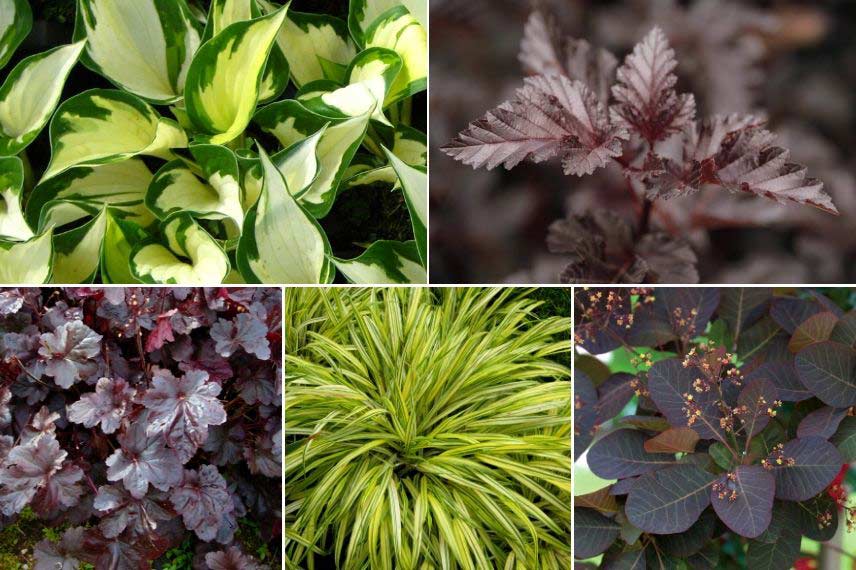 Les hostas à feuilles vert clair ou panachées permettent de créer du contraste avec des vivaces à feuillages sombres. Choisissez par exemple l’hosta ‘Morning Light’, que vous planterez aux côtés de l’Ophiopogon planiscapus ‘Nigrescens’, de l’heuchère ‘Obsidian’ et de l’Ajuga reptans ‘Black Scallop’… Au niveau des arbustes, intégrez le Sureau ‘Black Lace’, le Cotinus ‘Grace’ ou ‘Royal Purple’ ou le Physocarpus ‘Midnight’. Apportez aussi de petites touches lumineuses pour accompagner l’Hosta grâce à l’Hakonechloa macra ‘Aureola’ ou à la Lysimaque nummularia ‘Aurea’. Vous obtiendrez un massif saisissant par son contraste !