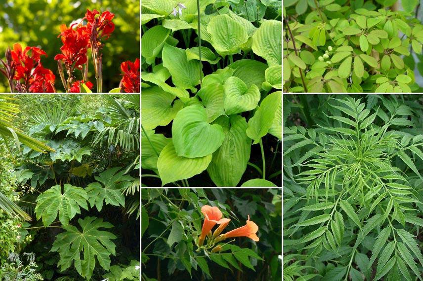 Il faut reconnaître que l’Hosta offre un feuillage impressionnant, qui s’intègre très bien dans une scène exotique. Choisissez parmi les hostas géants : par exemple la variété ‘Empress Wu’, qui atteint jusqu’à 1,30 m en tous sens. Vous pouvez aussi opter pour l’Hosta ‘Sum and Substance’, qui prend une belle teinte vert clair – jaune. L’idée est de rassembler des plantes aux feuillages généreux pour créer une ambiance de « jardin jungle ». Installez par exemple du Gunnera, des Fougères arborescentes, du Datisca cannabina, du Fatsia japonica… Vous pouvez planter un bananier rustique, comme le Musa basjoo, qui supporte entre – 12 et – 15 °C. Les lianes ou plantes grimpantes auront également toute à leur place dans ce style de jardin : choisissez par exemple l’Akebia quinata ou la Bignone. Pour ce qui est des floraisons, privilégiez les teintes chaudes (jaune, orange, rouge), avec par exemple l’Hedychium, le Canna, ou la capucine Tropaeolium tricolor.