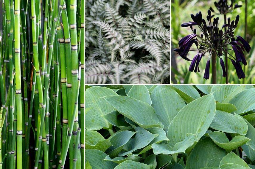 Les hostas s’intègrent à merveille dans une scène épurée et graphique, par exemple dans un jardin de ville au style contemporain. Choisissez une variété telle que l’Hosta tardiana ‘Halcyon’, qui porte de superbes feuilles gris-bleuté. Pour structurer le massif, installez des prêles, des érables japonais et quelques arbustes taillés de façon nette. Ils créeront un décor formel et sobre. Vous pouvez aussi délimiter les massifs avec des bordures d’Ophiopogon planiscapus ou de Liriope muscari. Pour les floraisons, choisissez des teintes neutres et chic, comme le blanc, bleu-gris, noir, rouge bordeaux, pourpre… mais évitez les couleurs trop vives comme le rose, orangé ou jaune. Vous pouvez opter par exemple pour l’Echinops ritro, les Agapanthes ou les Alliums, qui portent de belles inflorescences sphériques. Enfin, les fougères comme l’Athyrium niponicum trouvent également leur place dans ce style de jardin ! Elles amèneront un graphisme incomparable et beaucoup de légèreté.