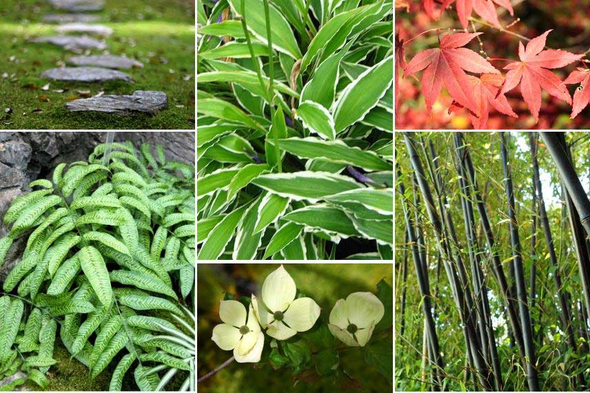 Originaires de Chine, du Japon et de Corée, les hostas sont parfaits pour composer un jardin asiatique ou jardin zen. Vous pouvez installer en arrière-plan ou sur le tour du jardin une bordure de bambous, qui amèneront beaucoup de graphisme et de verticalité. Les érables du Japon, eux, viendront apporter une touche de poésie par leur silhouette élégante et leur feuillage découpé, qui prend de très belles teintes automnales. N’hésitez pas non plus à installer des arbustes taillés en nuage (niwaki). Profitez du port très étagé, formé de branches horizontales, du Cornus kousa, un cornouiller qui porte en fin de printemps une élégante floraison, constituée de quatre grands pétales blancs. Vous pouvez aussi intégrer des fougères comme le Coniogramme emeiensis, dont les frondes sont striées de jaune. Utilisez des plantes tapissantes comme l’Helxine ou la Sagine subulée, afin de couvrir le sol comme de la mousse. Pour ce qui est des hostas, je vous conseille la variété ‘Stiletto’, pour ses feuilles joliment effilées et bordées d’un liseré blanc.