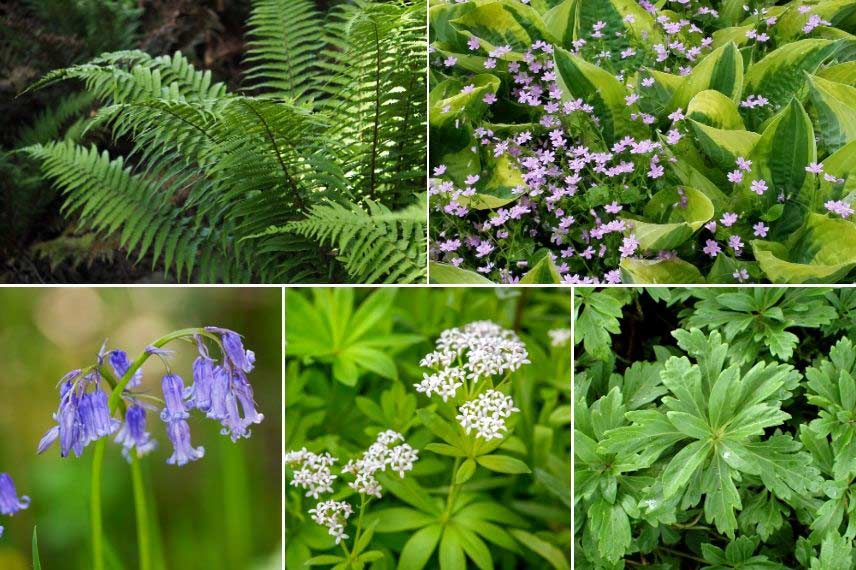 Comme elles se plaisent en terrain frais et ombragé, les hostas sont parfaits au pied des arbres, pour recréer l’ambiance naturelle des forêts. Ce sentiment de nature et de fraîcheur sera renforcé par le feuillage délicat des fougères, comme le Dryopteris wallichiana, qui porte de grandes feuilles plumeuses, vert franc. Le Sceau-de-Salomon trouvera sa place à leurs côtés, avec son magnifique feuillage et ses belles fleurs blanches en clochettes retombantes. Vous pouvez aussi créer des tapis d’Aspérules odorantes, une superbe petite vivace au feuillage étoilé et aux petites fleurs blanches, délicates. Profitez également des floraisons de l’Epimedium, du Geranium nodosum, de l’Allium ursinum, de la digitale ou du Montia sibirica. Découvrez aussi la Jacinthe des bois, appréciée pour sa délicate floraison bleue, en clochettes. Concernant les hostas, je vous conseille une variété dont le contour des feuilles est délicatement réhaussé par un liseré blanc ou jaune crème, afin d’amener une petite touche lumineuse dans ce jardin ombragé : par exemple ‘Shade Fanfare’ ou ‘Twilight’. L’association de ces plantes vous assurera une ambiance fraîche et luxuriante, idéale pour se ressourcer !