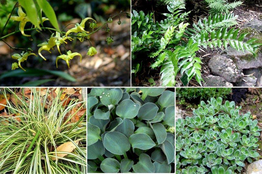 Vous pouvez tout à fait implanter des hostas dans une rocaille ombragée. Dans ce cas, choisissez de préférence une variété naine, comme ‘Blue Mouse Ears’, qui porte de petites feuilles gris-bleuté. Créez un massif surélevé, à l’ombre des arbres, et placez-y de grosses pierres qui maintiendront la terre en place. Plantez entre les pierres des Epimédiums, des Corydales, du Liriope muscari… On privilégie les petites plantes, qui poussent en touffe ou en tapis. Profitez aussi des fougères comme la Scolopendre ou le Cyrtomium falcatum. Le feuillage panaché de la graminée Carex morrowii ‘Variegata’ viendra apporter un peu de luminosité. Découvrez aussi la délicate Saxifraga umbrosa ‘Variegata’., qui porte des feuilles imbriquées en rosettes et dévoile au printemps de petites fleurs blanches, très délicates. N’hésitez pas non plus à couvrir le sol avec la Sagine subulée, une petite vivace qui ressemble à de la mousse et qui embrasse la forme du sol. Pour plus d’idées et d’inspiration, consultez notre fiche-conseil : « 10 plantes pour aménager une rocaille d’ombre »