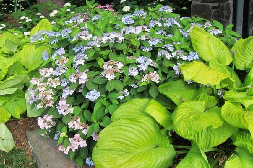 De généreux Hostas ‘Sum and Substance’ donnent la réplique à des Hydrangeas (© K M)