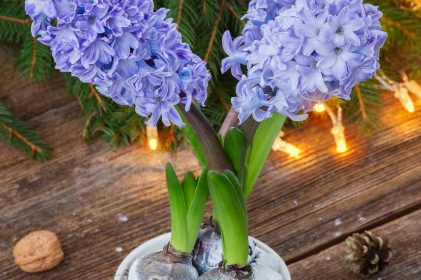 Les jacinthes se déclinent en de nombreux coloris doux (blanc, rose, rouge, bleu, mauve) s’accordant bien à un décoration de Noël.