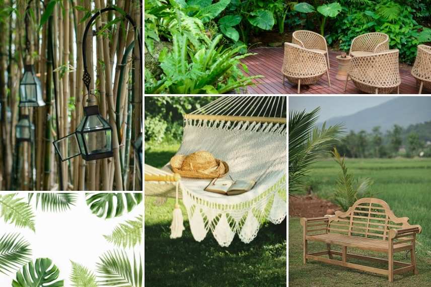 Le mobilier fera idéalement la part belle aux essences exotiques : on utilisera surtout des bois comme l’Acacia (à privilégier, car de provenance moins lointaine que nombre de bois tropicaux), le teck pour le choix des tables, assises, bancs, etc. Le banc en teck traditionnel peut être représenté par le célèbre banc Luytens, au style colonial très intéressant dans cette atmosphère. Les salons et fauteuils en rotin sont également des incontournables pour amener du dépaysement. Le hamac, sobre en corde écrue ou au contraire en tissu coloré, est l’indispensable objet à montrer… ou à suggérer dans le fouillis végétal lorsque l’on souhaite parfaire l’ambiance de ce jardin luxuriant et relaxant ! Des lanternes, elles aussi, en bambou ou en bois, voire en métal travaillé façon moucharabié pour se croire au jardin Majorelle, seront les compléments charmants pour illuminer vos soirées d’été. N’oubliez pas les coussins aux motifs exotiques, toujours tendance malgré les modes, entre toucans, oiseaux de paradis, feuillages de palmiers et autres fougères !