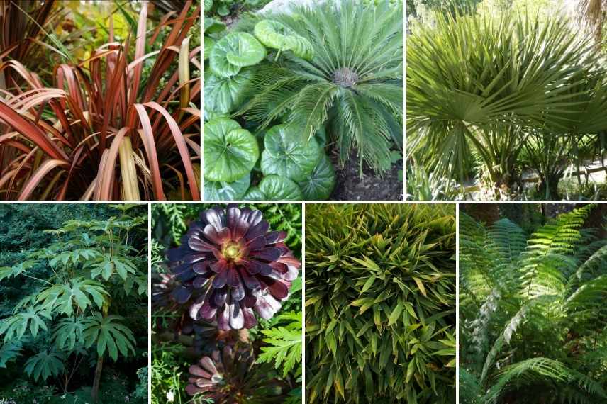 - Des plantes structurantes : Bambous (Phyllostachys, Fargesias), Musas, Agaves, Palmiers, Phormium, Dicksonia antartica, Gunnera manicata, Melianthus major, Mangave, Schefflera taiwaniana…