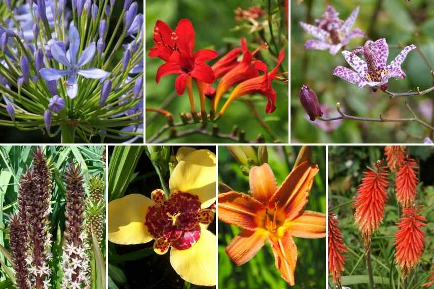 Agapanthe, Crocosmia, Tricyrtis ‘Hirta’, Eucomis ‘Sparking Burgundy’, Tigridia pavonia ‘Aurea’, Hemerocalle, Kniphofia