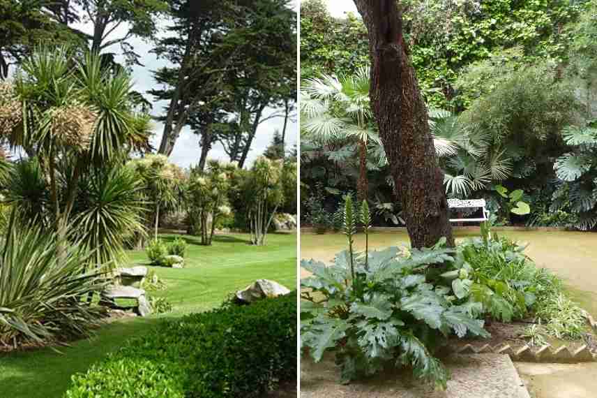 - Un jardin au soleil exotique : de nombreux palmiers, Euphorbia mellifera, Leptospermums, Hedychiums, Cycas, Hibiscus moscheutos, Cannas, Viperine des Canaries, Grevilleas, Strelitzias, Puyas, Callistemons, Melianthus major, Yuccas, Gunneras, Aeoniums, Malaleuca, Mangaves, Alstroemerias, Watsonias, Catalpa bignonioides, etc.