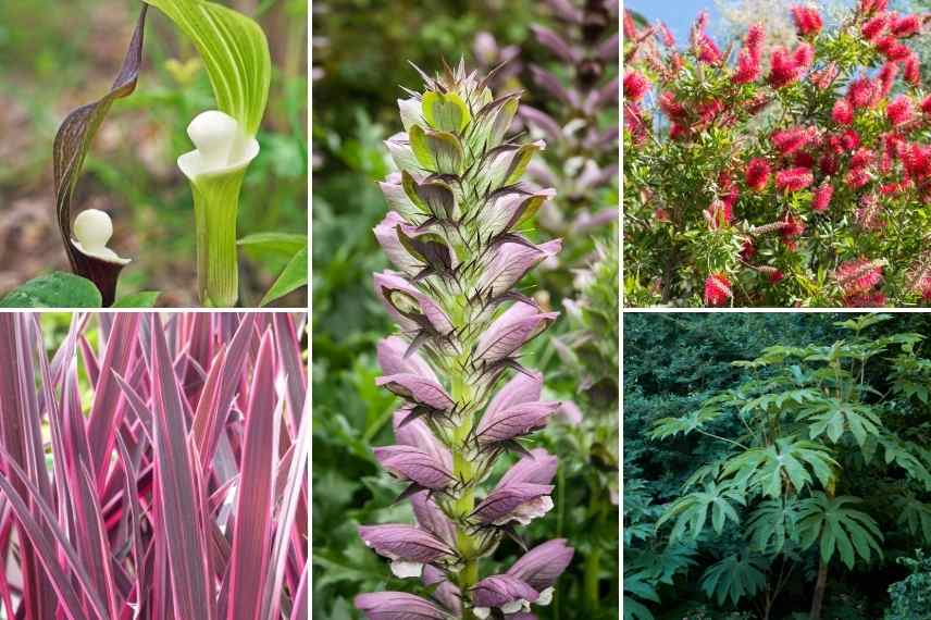 Arisaema sikokianum, Cordyline Australis “Pink Passion”, Acanthe, Callistemon et Tetrapanax pour une exposition légèrement ombragée