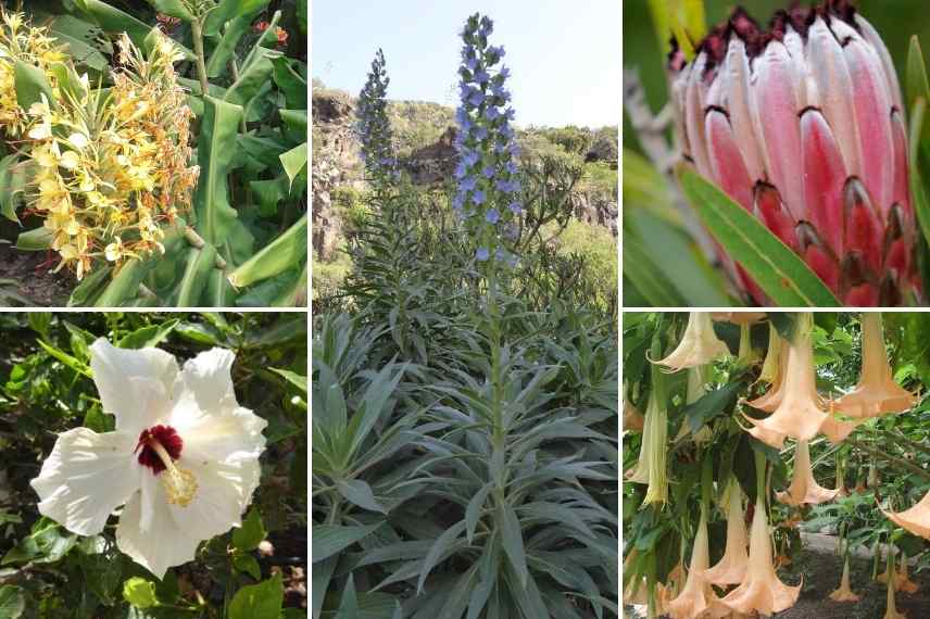 - Des fleurs spectaculaires : Hibiscus, Brugmansia, Echium candicans, Callistemon, Puya, Protea, Hedychium, Strelitzia, Malaleuca, Leucospermum, Solandra grandiflora…