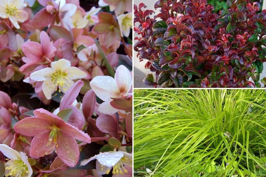 Pour réaliser cette potée, prenez un Hellébore nigercors ‘Emma’. Cette variété est très florifère et vraiment peu exigeante. En hiver, les nombreux boutons laissent place à de superbes fleurs blanches puis rose pourpre. Elle sera mise en valeur devant le feuillage torsadé d’un Leucothoe aux couleurs changeantes au fil des saisons : pourpre au débourrement (en saison froide, sinon il garde son feuillage en hiver), vert soutenu pour s’empourprer de nouveau en automne/hiver. Enfin, ajoutez une graminée retombante comme le Carex ‘Everillo’ au feuillage jaune qui se plaît à jouer avec le moindre rayon de soleil hivernal.