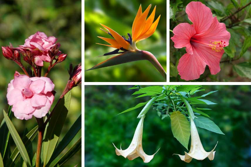 Laurier rose, Oiseau du Paradis, Hibiscus et Brugmansia