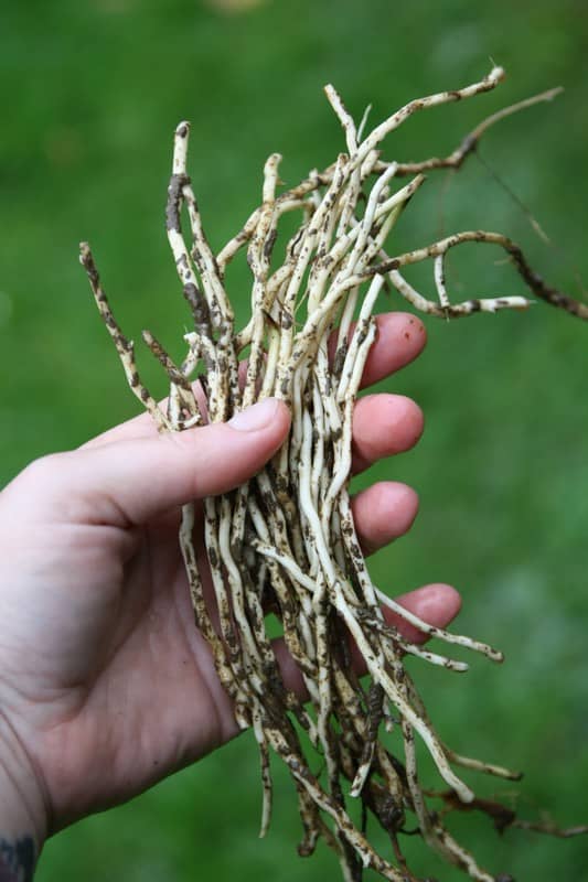 - lors du travail du sol, enlevez un maximum de racines en soulevant la terre à l’aide d’une fourche-bêche ou d’une grelinette. Brûlez les racines une fois séchées.