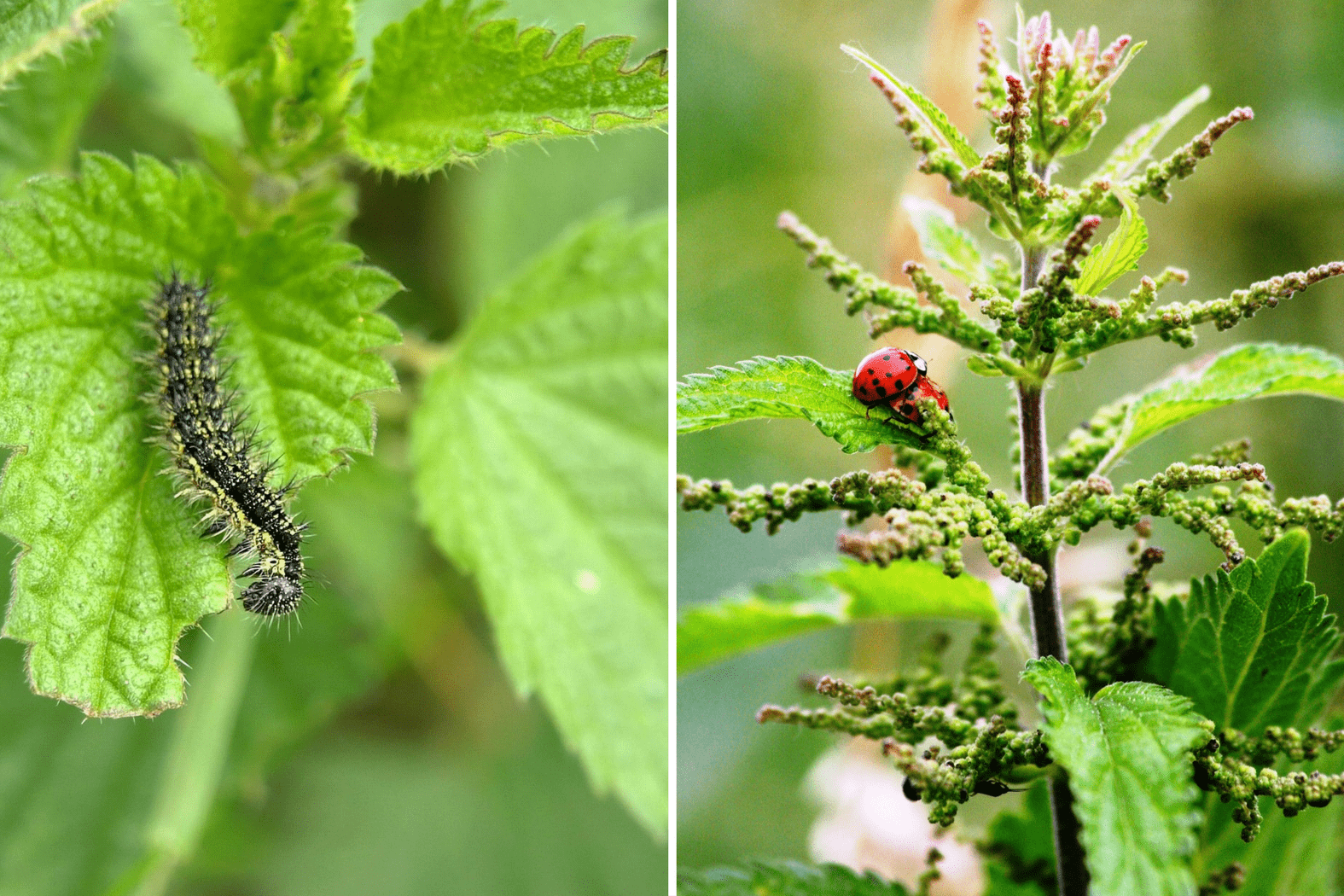 A gauche : Chenille du papillon Petite tortue (Aglais urticae) – A droite : saison des amours chez les coccinelles.