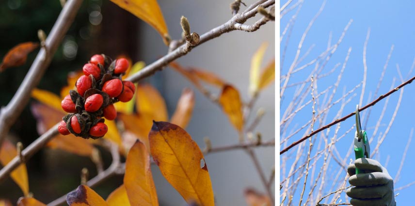 Le port du magnolia étant naturellement harmonieux, la taille se limite à une taille d’entretien annuelle qui permettra de rééquilibrer la ramure de l’arbuste et d’éclaircir le branchage en éliminant les branches entrecroisées.