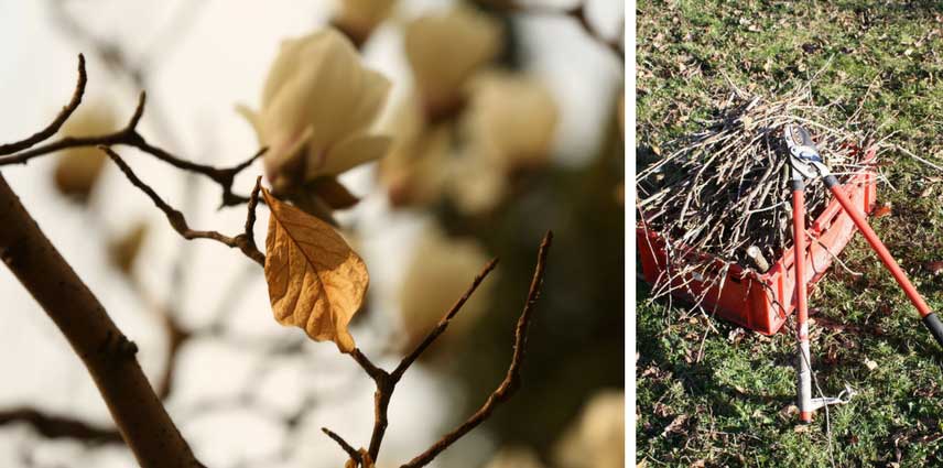 Le principe d’une taille d’entretien est uniquement de rééquilibrer, voir de réduire la ramure et d’éliminer les branches entrecroisées et les vieux rameaux pour conserver au magnolia une jolie forme.