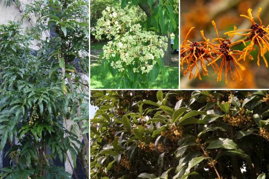 Mahonia russellii, Arbre à miel (Euodia dianelii), Hamamelis x intermedia ‘Aphrodite’, Osmanthus fragrans ‘Aurantiacus’