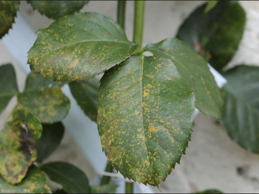 Des taches noires plutôt rondes aux contours filandreux, souvent bordées d’une auréole jaune, se développent tout d’abord sur les feuilles basses. Les folioles atteintes jaunissent rapidement et chutent prématurément. Elles se décrochent au moindre contact. Lors d’une forte attaque, les rosiers peuvent se retrouver totalement défeuillés au milieu de l’été. La chute prématurée bloque la végétation, et lorsque le rosier redémarre, il consacre toute son énergie à former un nouveau feuillage, au détriment des bourgeons floraux.