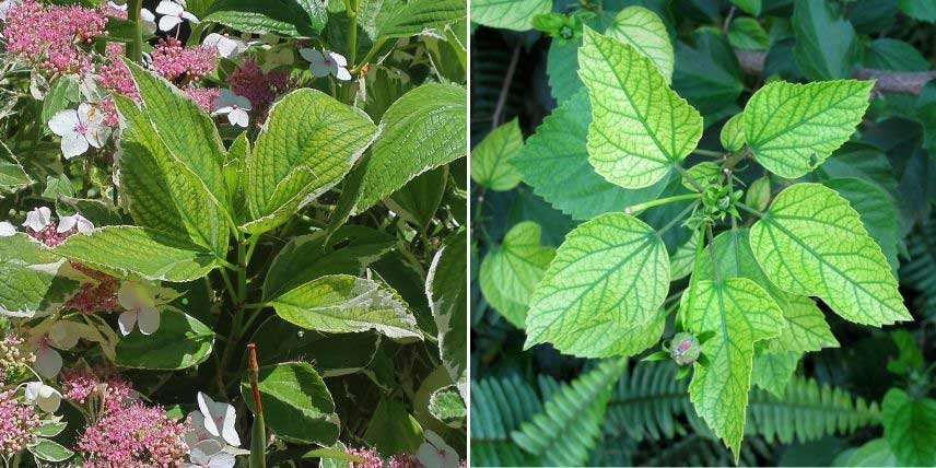 La chlorose sur un hortensia et sur un hibiscus (photo Cultivar413 / Malcolm Manners)
