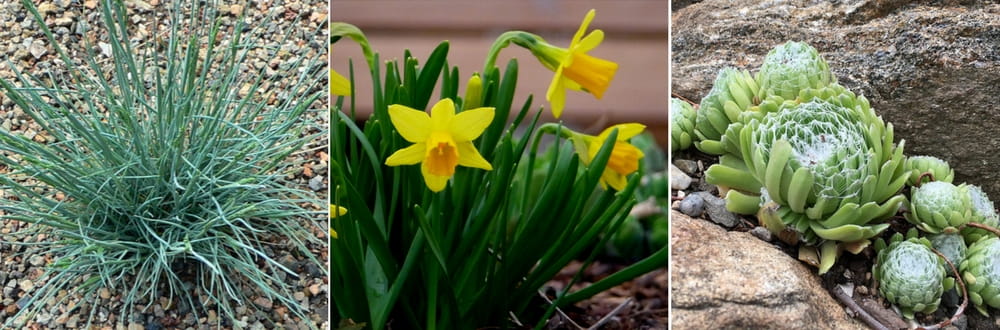 Certains narcisses peuvent se planter en rocaille. Tournez-vous alors vers les Narcisses botaniques ou les petites variétés, comme les Narcissus tazetta. Vous pouvez ainsi choisir le narcisse ‘Tête à tête’, une variété hâtive, à fleurs jaunes. Pour une floraison originale, optez plutôt pour Narcissus bulbocodium ‘Cantabricus’. Associez-les à de petites plantes tapissantes, comme les sédums ou joubarbes. Plantez à leurs côtés des œillets et quelques graminées : des touffes de Festuca, Stipa ou Carex.