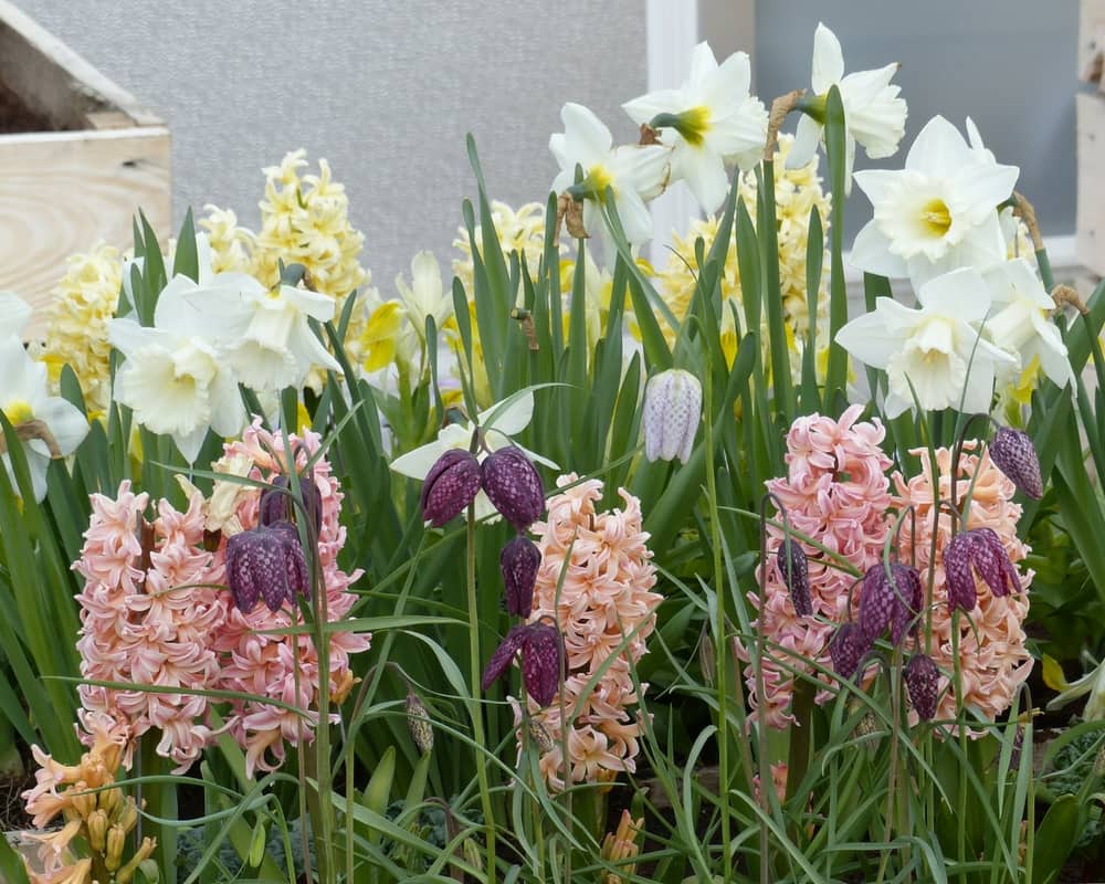 Créez une belle harmonie de couleurs en rassemblant uniquement des plantes dans les mêmes tons : pour une scène blanche, vous pouvez associer les narcisses ‘Mount Hood’ aux tulipes ‘Concerto’, aux jacinthes ‘Carnegie’, aux muscaris ‘White Magic et aux Anémones ‘The Bride’. Vous pouvez faire la même chose avec des fleurs jaunes.