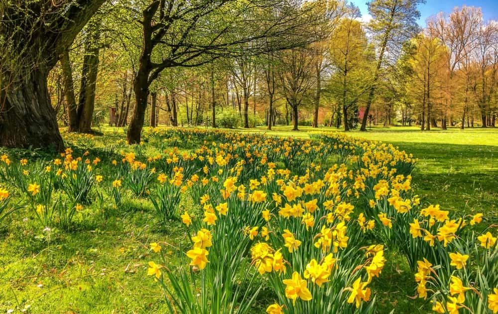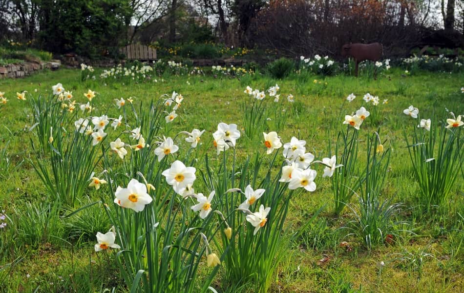 Plantez une grande quantité de narcisses dans une pelouse pour créer une vague de fleurs jaunes ou blanches ! L’aspect est vraiment impressionnant, avec toutes ces plantes qui illuminent la pelouse au printemps. Suivant la densité et la variété choisie, vous obtiendrez une ambiance plus ou moins naturelle. Vous pouvez jouer avec les formes, les installer de façon dense et uniforme, ou les concentrer au pied des arbres, ou encore disperser quelques touffes dans la pelouse, éventuellement mêlées à d’autres bulbeuses. Dans ce dernier cas, vous obtiendrez un effet très sauvage.