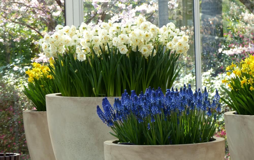 Plantez vos narcisses dans des jardinières que vous placerez à côté de l’entrée de votre maison, ou sur un rebord de fenêtre. Vous profiterez ainsi du parfum des fleurs de narcisses au printemps ! Et vous pourrez facilement composer des bouquets, sans avoir besoin de sortir au fond du jardin, alors que les températures sont encore fraîches. Choisissez les variétés les plus petites : les Narcisses ‘Paperwhite’ et ‘Tête à tête’ s’y prêtent particulièrement bien ! Découvrez aussi la délicate floraison du Narcissus tazetta ‘Minnow’. Associez-les à des myosotis et pensées, et à d’autres bulbes comme les muscaris, jacinthes ou tulipes. Vous pouvez planter les bulbes ensemble, dans un même pot mais à des profondeurs différentes.