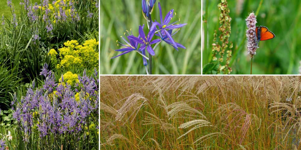 Composez un jardin inspiré de la nature, avec des graminées (Miscanthus ou Pennisetum) et des plantes à floraison aérienne, au port très libre et élancé. Elles apporteront à votre jardin un côté très léger et sauvage. Vous pouvez ainsi marier Persicaria bistorta avec l’euphorbe des marais (Euphorbia palustris) et le Camassia, jolie bulbeuse à la délicate floraison bleue étoilée.