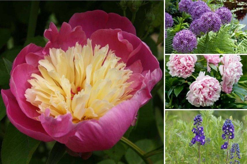 Pivoine ‘Bowl of Beauty’, Allium christophii, Pivoine ‘Sarah Bernhardt’ et Delphinium violet comme ‘King Arthur’