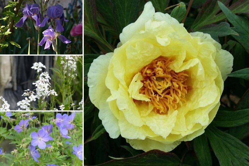 Pivoine ‘Lemon Chiffon’, Iris pallida ‘Variegata’, Hesperis matronalis ‘Alba’ et Geranium vivace ‘Johnson’s Blue’
