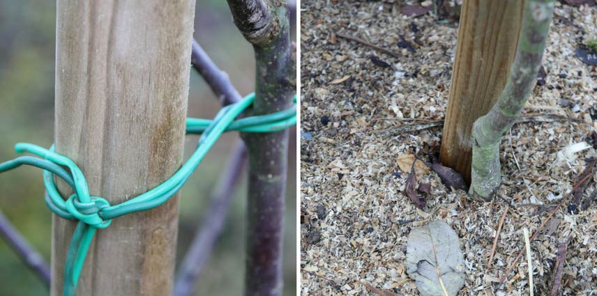 Le tuteurage, en formant un 8 avec un lien souple / le paillage du pied du fruitier