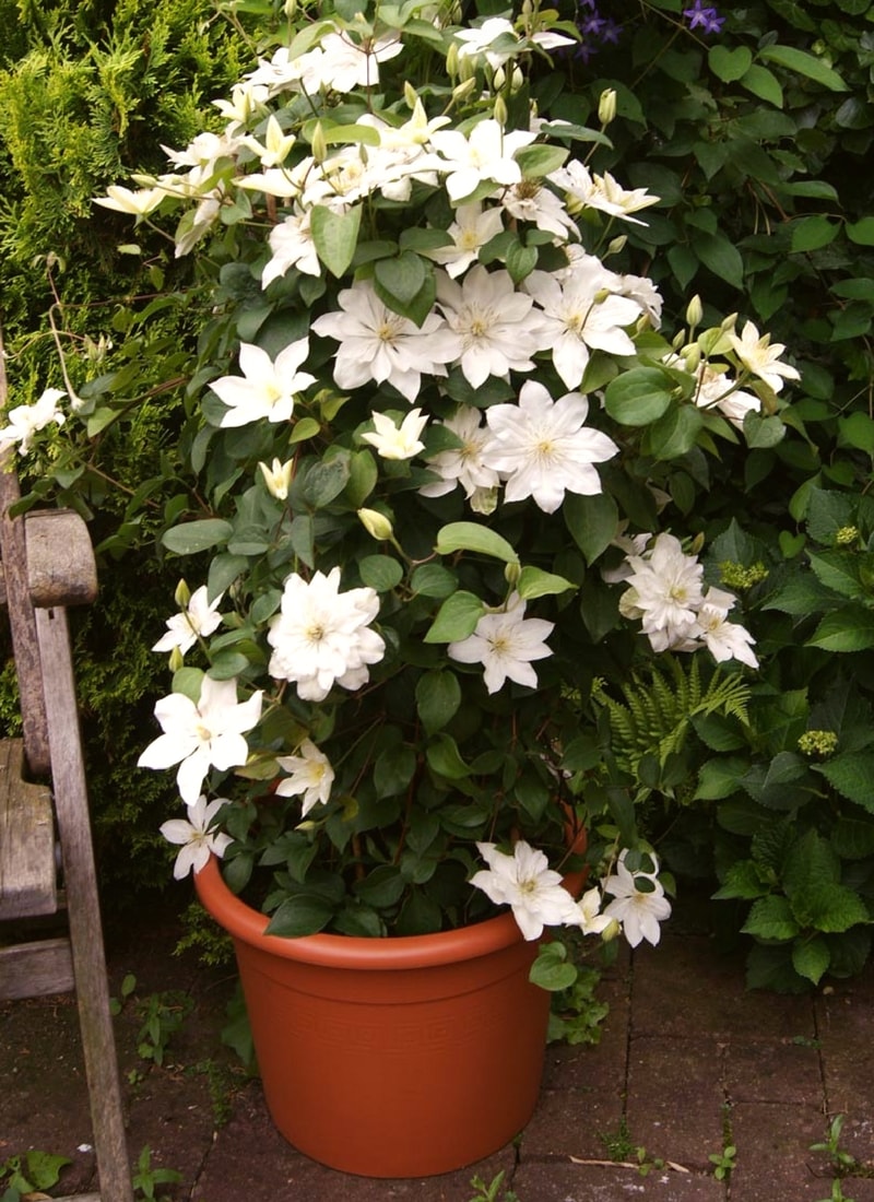 Évitez les variétés les plus grandes, comme les clématites montana : elles peuvent atteindre 8 m de hauteur et ne sont pas du tout adaptées à une culture en pot ! Choisissez au contraire les plus compactes (jusqu’à 1,50 ou 2 m), et celles qui poussent lentement. Parmi elles, la clématite ‘Baby Star’ nous séduit par sa généreuse floraison blanche en étoile. Découvrez aussi les superbes fleurs roses de la clématite Piilu ! Plus intenses, la variété ‘Astra Nova’ offre d’élégantes fleurs étoilées, d’un violet profond, contrasté par une bande plus claire au centre des sépales, tandis que la clématite ‘Westerplatte’ porte de surprenantes fleurs d’un rouge sombre. Enfin, la clématite integrifolia ‘Twinkle’ s’adapte aussi à une culture en pot, avec la particularité de ne pas être grimpante !